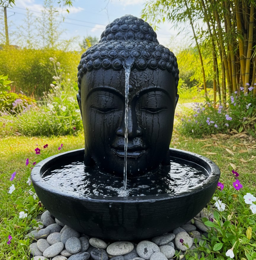 Finished in a deep black stone-look texture, this sculpture blends effortlessly with natural surroundings such as bamboo, pebbles, and flowering plants. The serene facial expression and detailed craftsmanship make it a striking focal point for gardens, courtyards, patios, meditation areas, or resort-style landscapes.